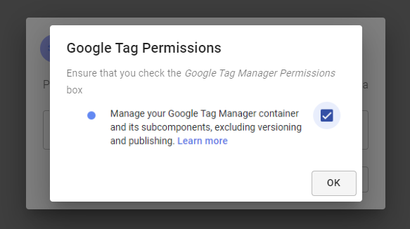 - Confirm GTM permissions required by checking the boxes (view may vary from image)