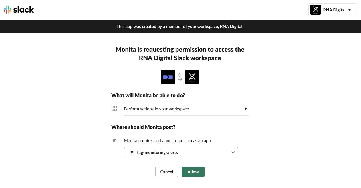 - Allow Slack to integrate with a workspace and select a channel which the App will post to