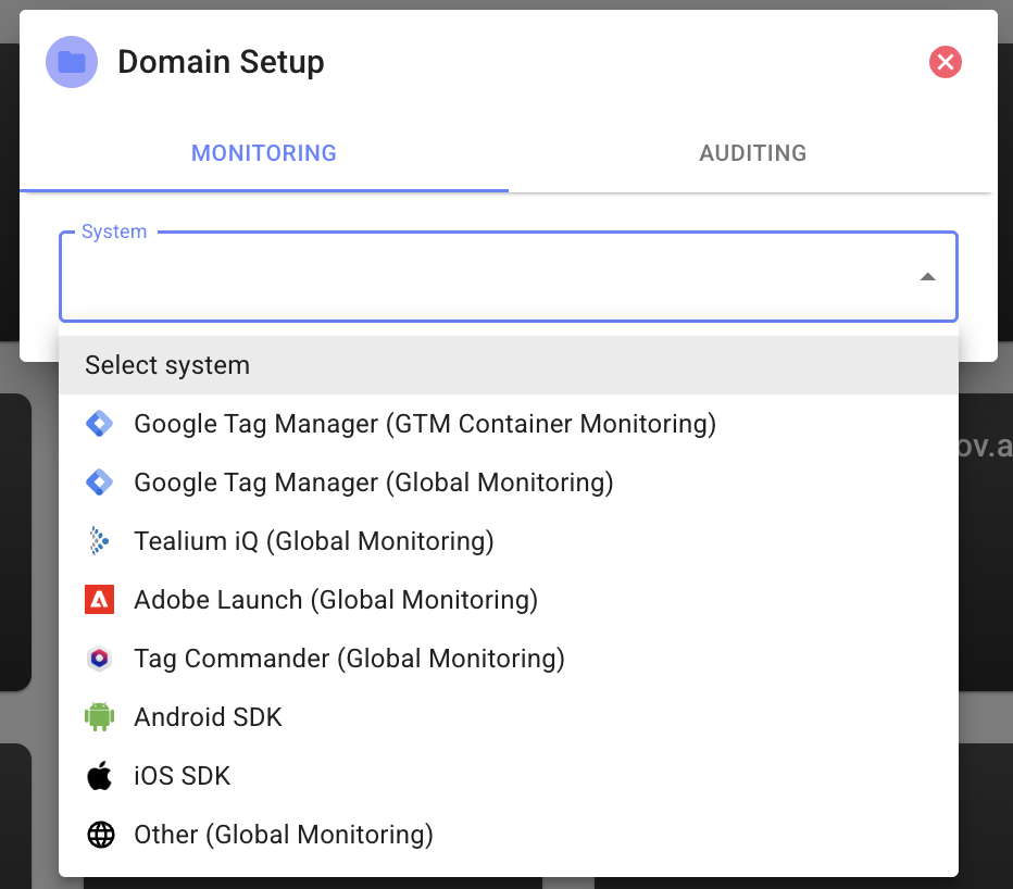 - Select iOS SDK or Global Monitoring (Use Global if you would like to use the same Domain for both web and mobile)